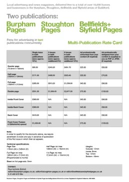 If you would like to advertise your business, service or event in the Stoughton Pages magazine please have a look at our ‘Rate Card’ shown below. This gives you all the relevant prices of the different sizes of ad and advertorial space available. We can help you with your artwork too.